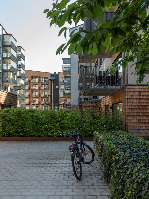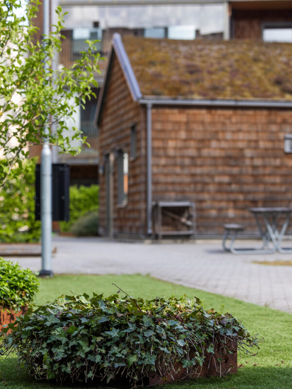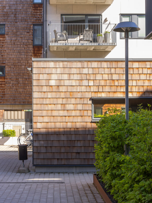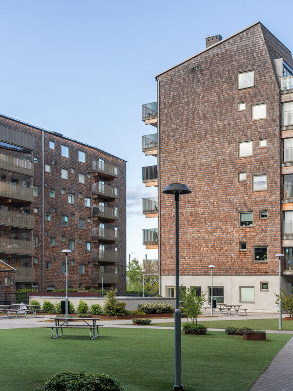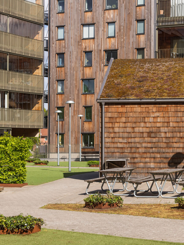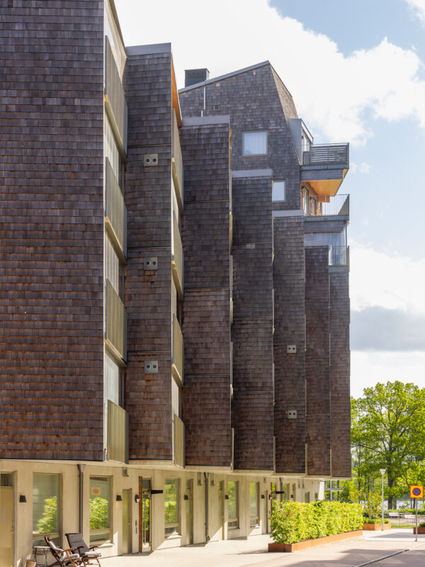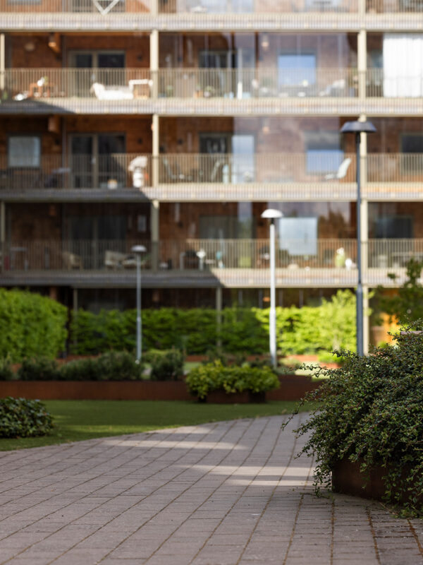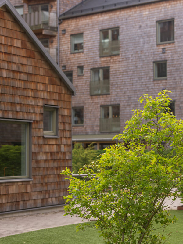 Byggnaderna uppfördes i två etapper, med massivträstomme som bärande materialval och cederspånpanel på fasaderna. Resultatet är ett kvarter med låg klimatpåverkan, sund inomhusmiljö och gedigen byggkvalitet – där varje bostad präglas av både funktion och karaktär.