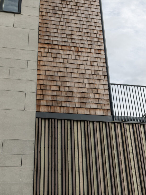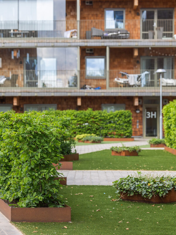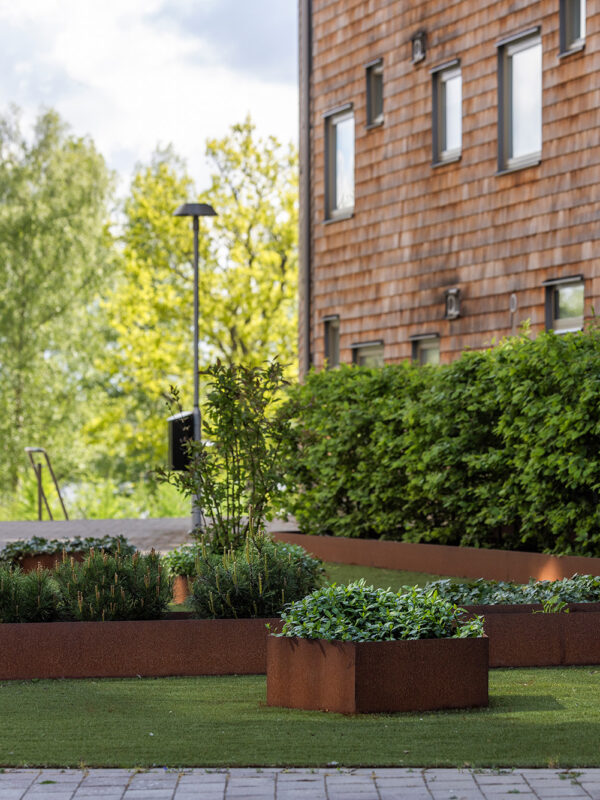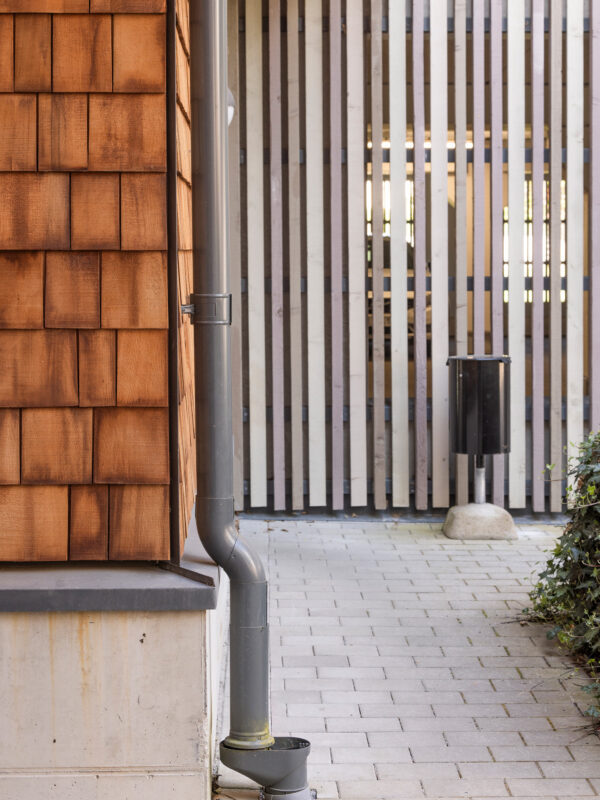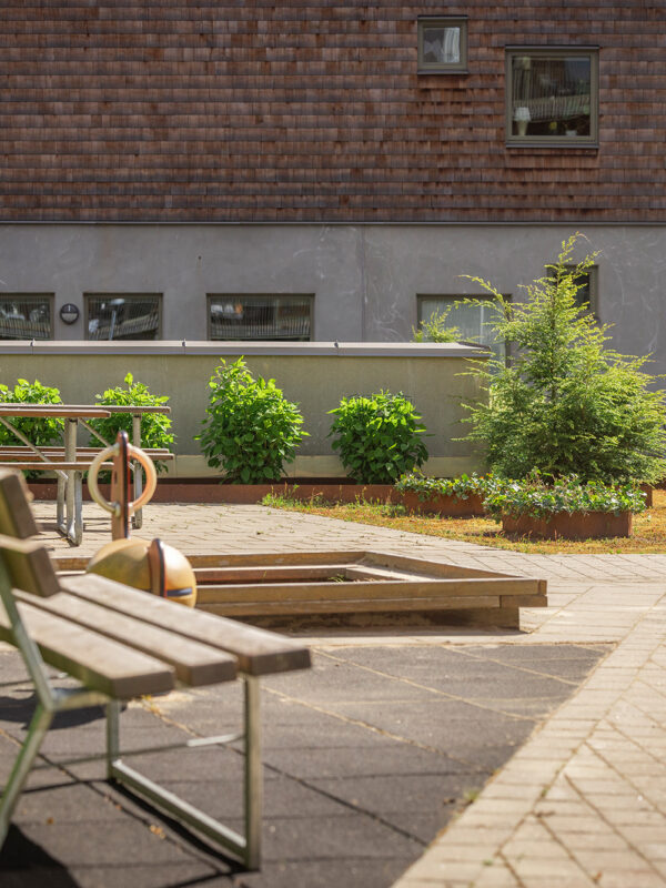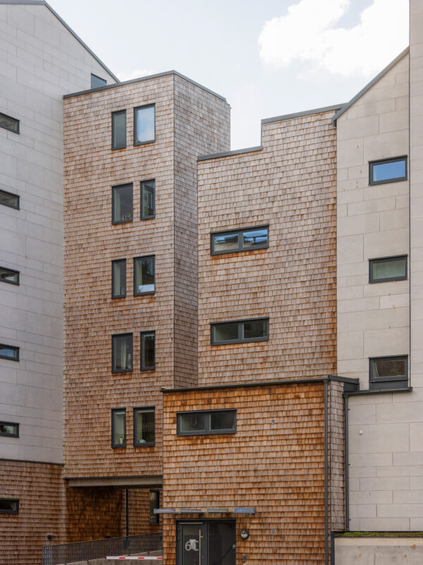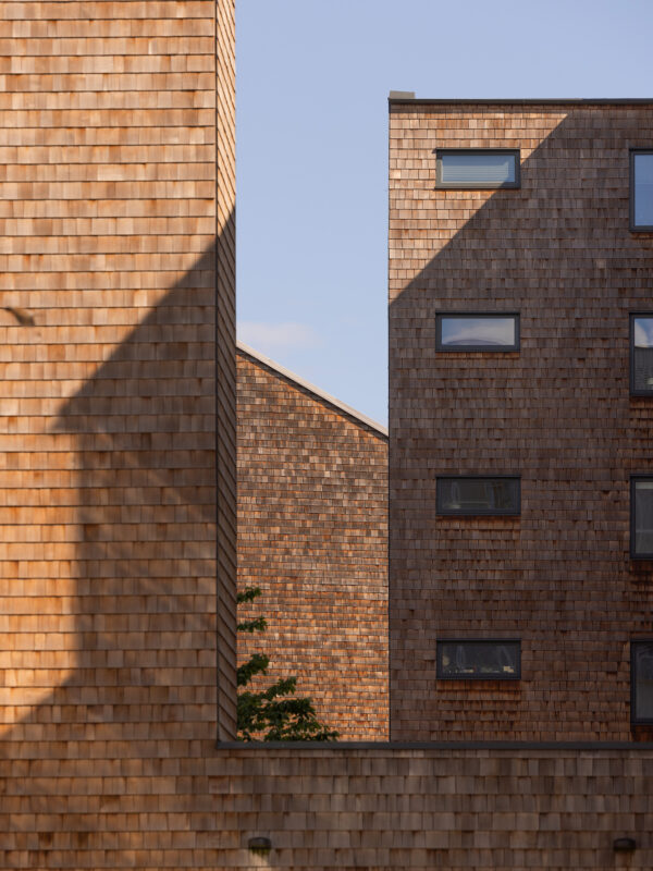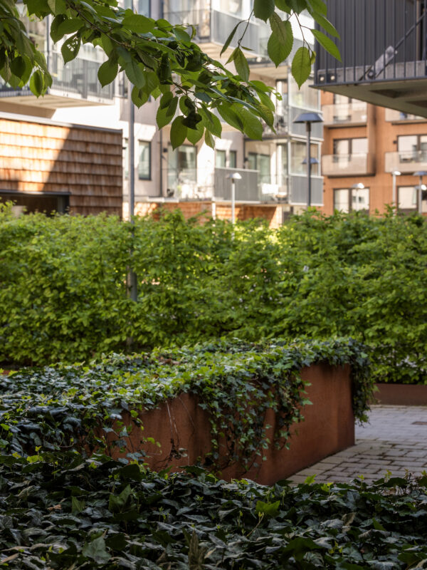 Byggnaderna uppfördes i två etapper, med massivträstomme som bärande materialval och cederspånpanel på fasaderna. Resultatet är ett kvarter med låg klimatpåverkan, sund inomhusmiljö och gedigen byggkvalitet – där varje bostad präglas av både funktion och karaktär.