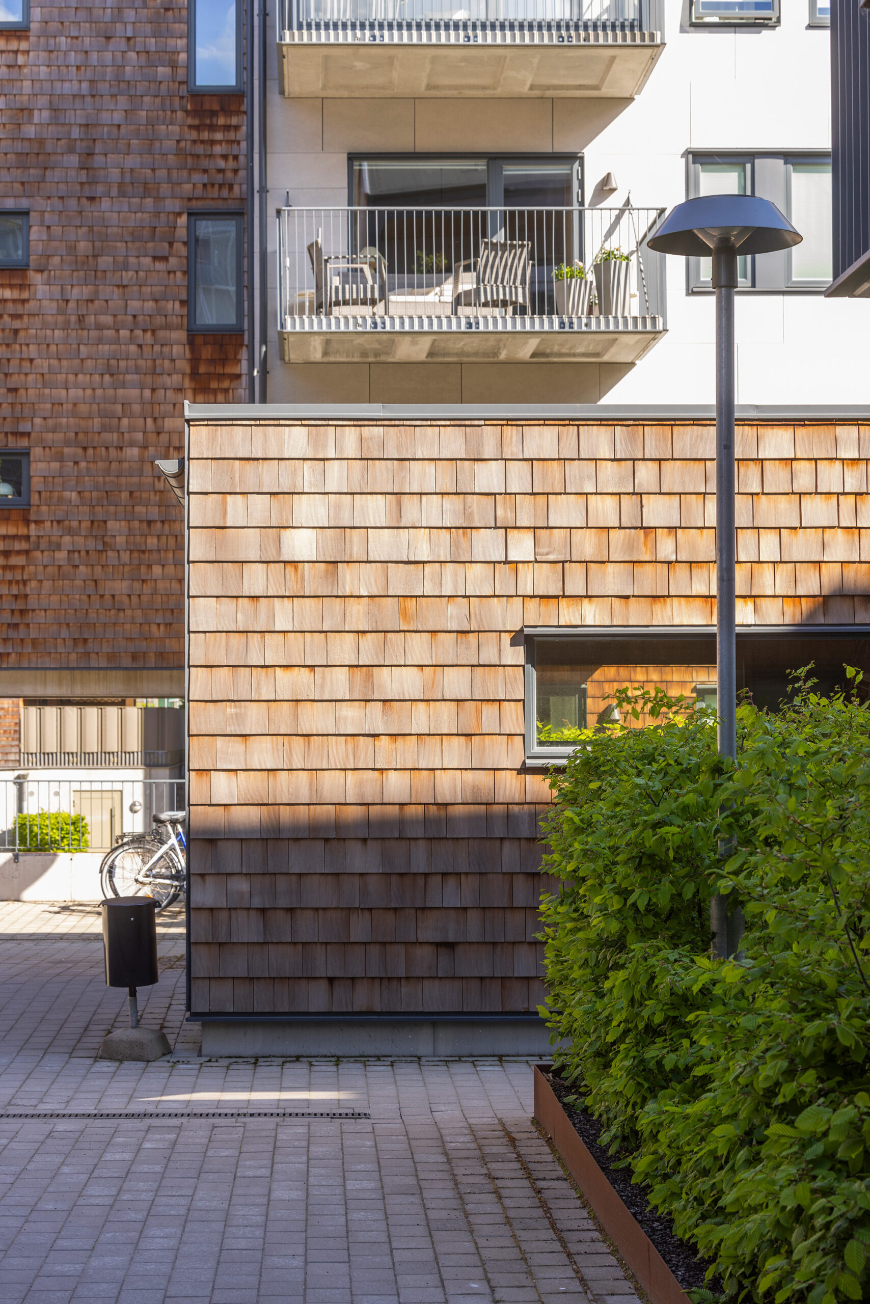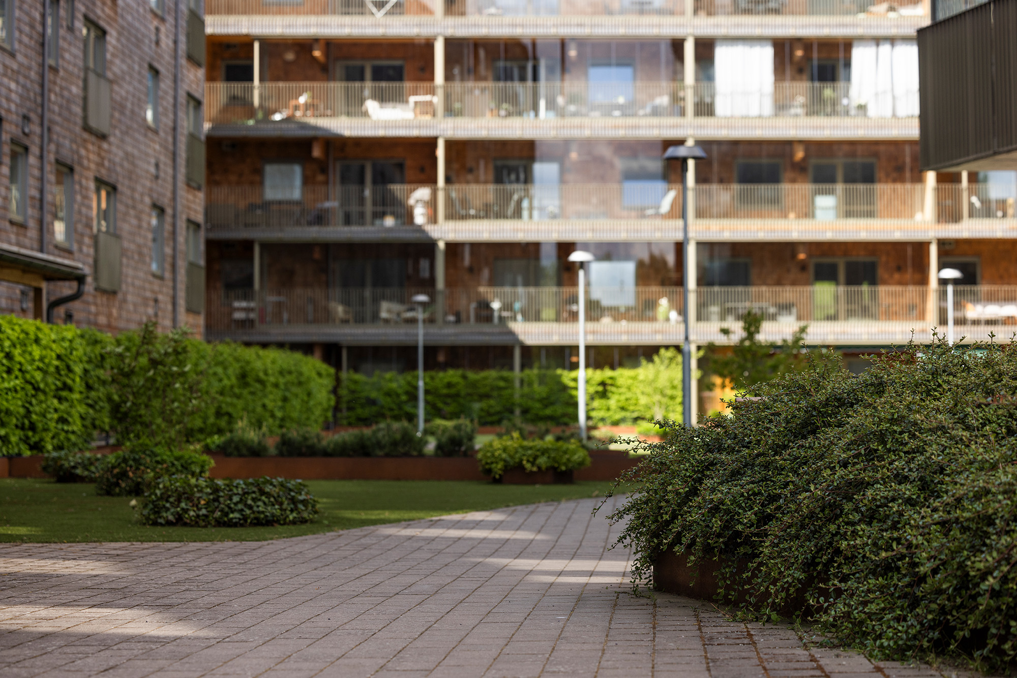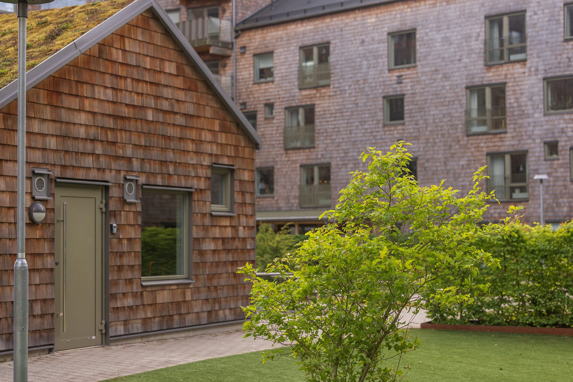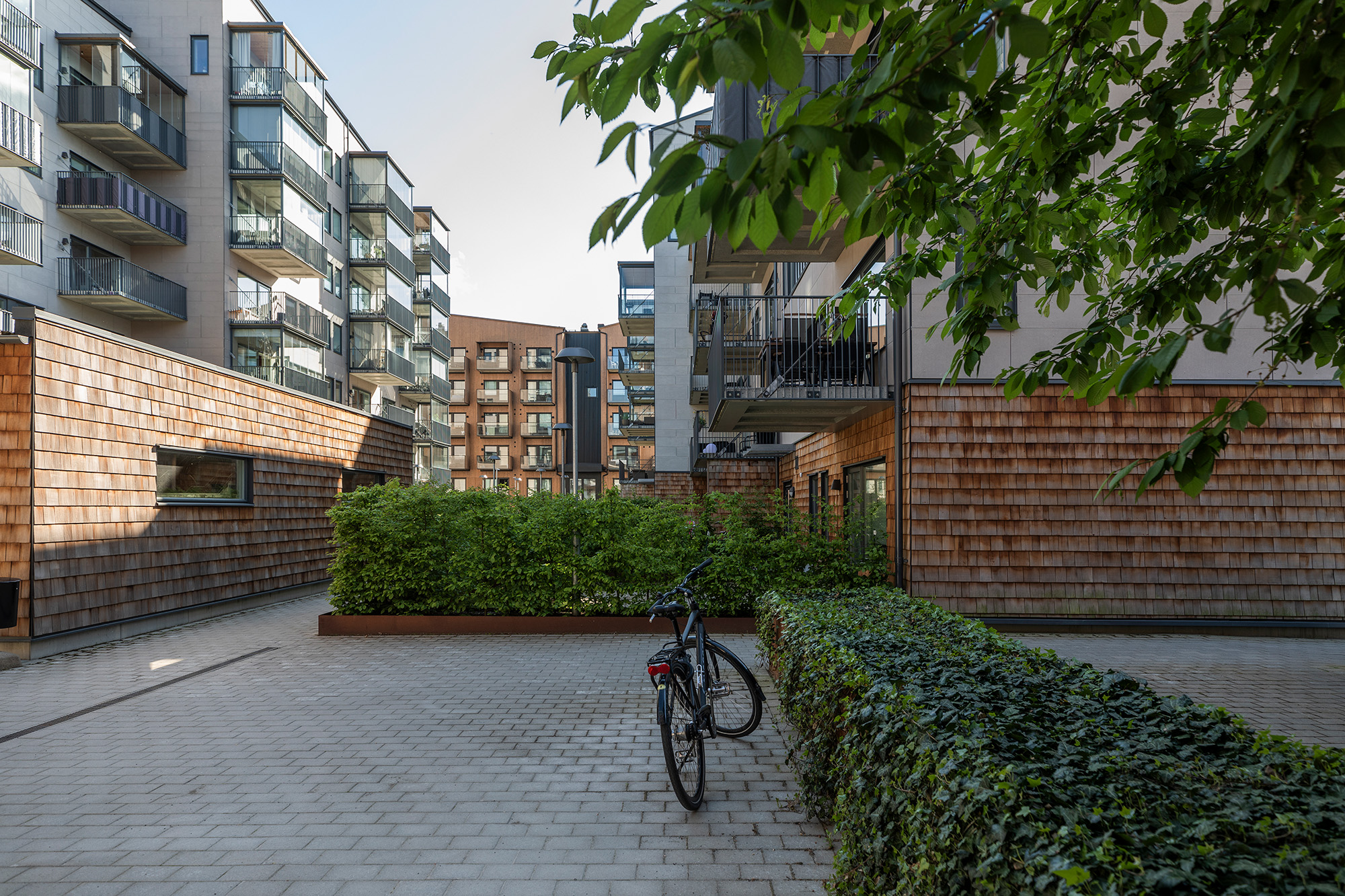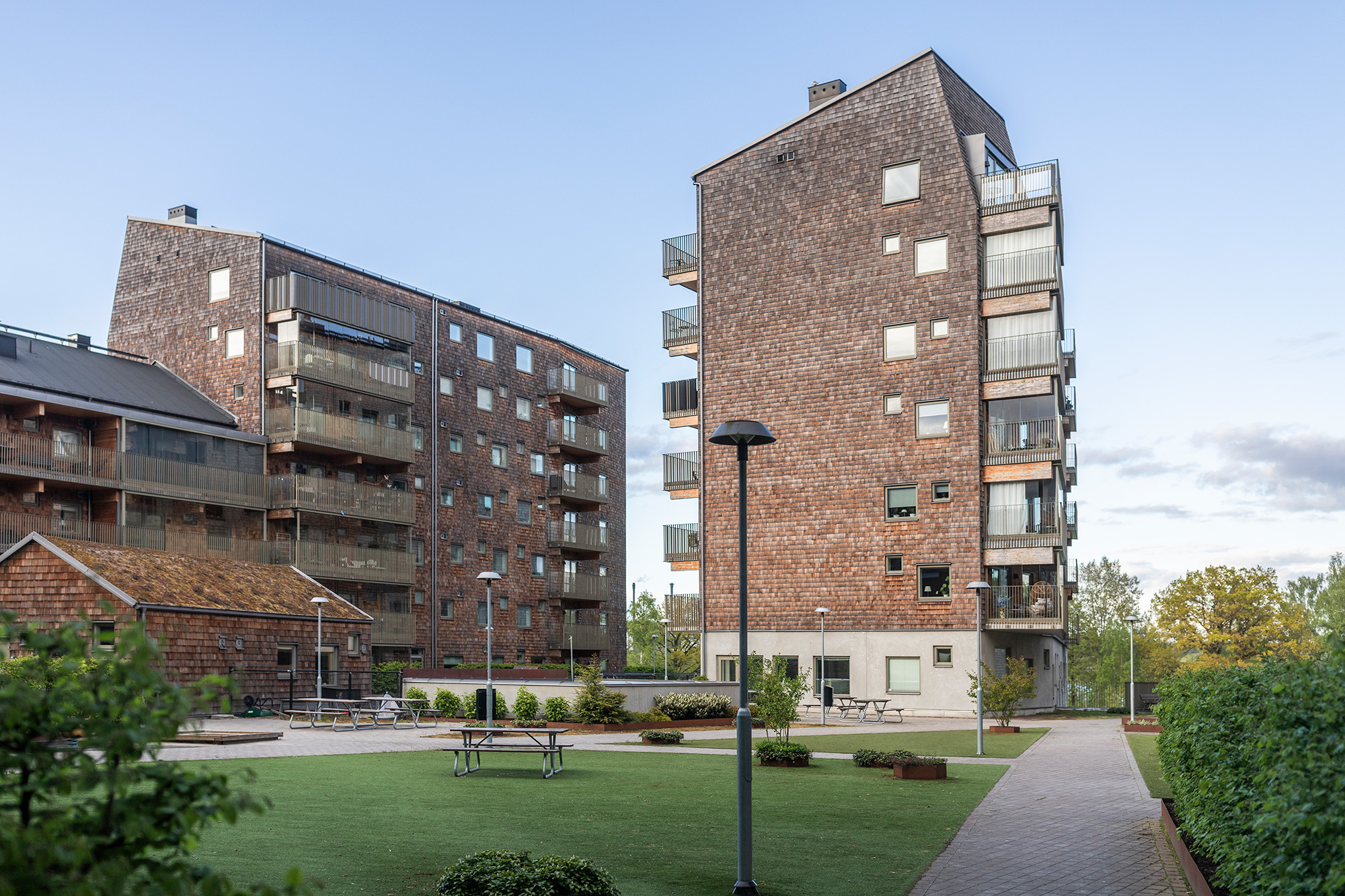 Byggnaderna uppfördes i två etapper, med massivträstomme som bärande materialval och cederspånpanel på fasaderna. Resultatet är ett kvarter med låg klimatpåverkan, sund inomhusmiljö och gedigen byggkvalitet – där varje bostad präglas av både funktion och karaktär.