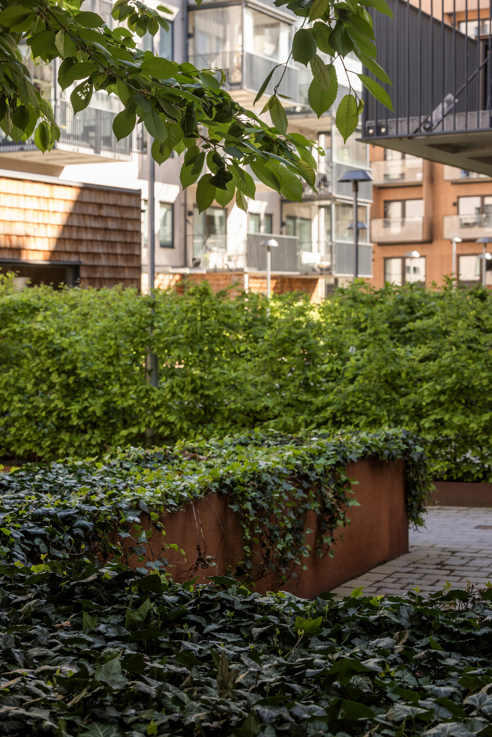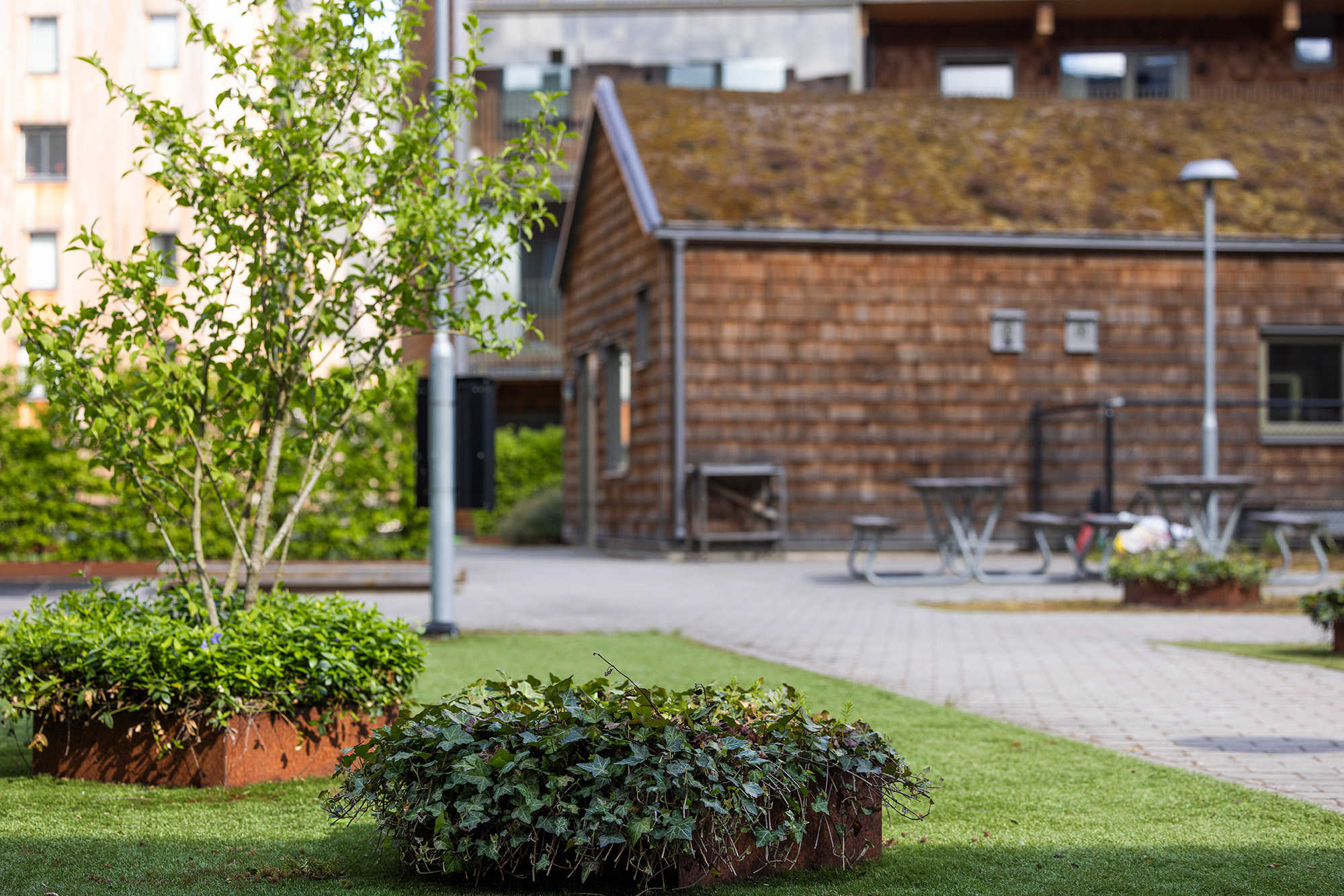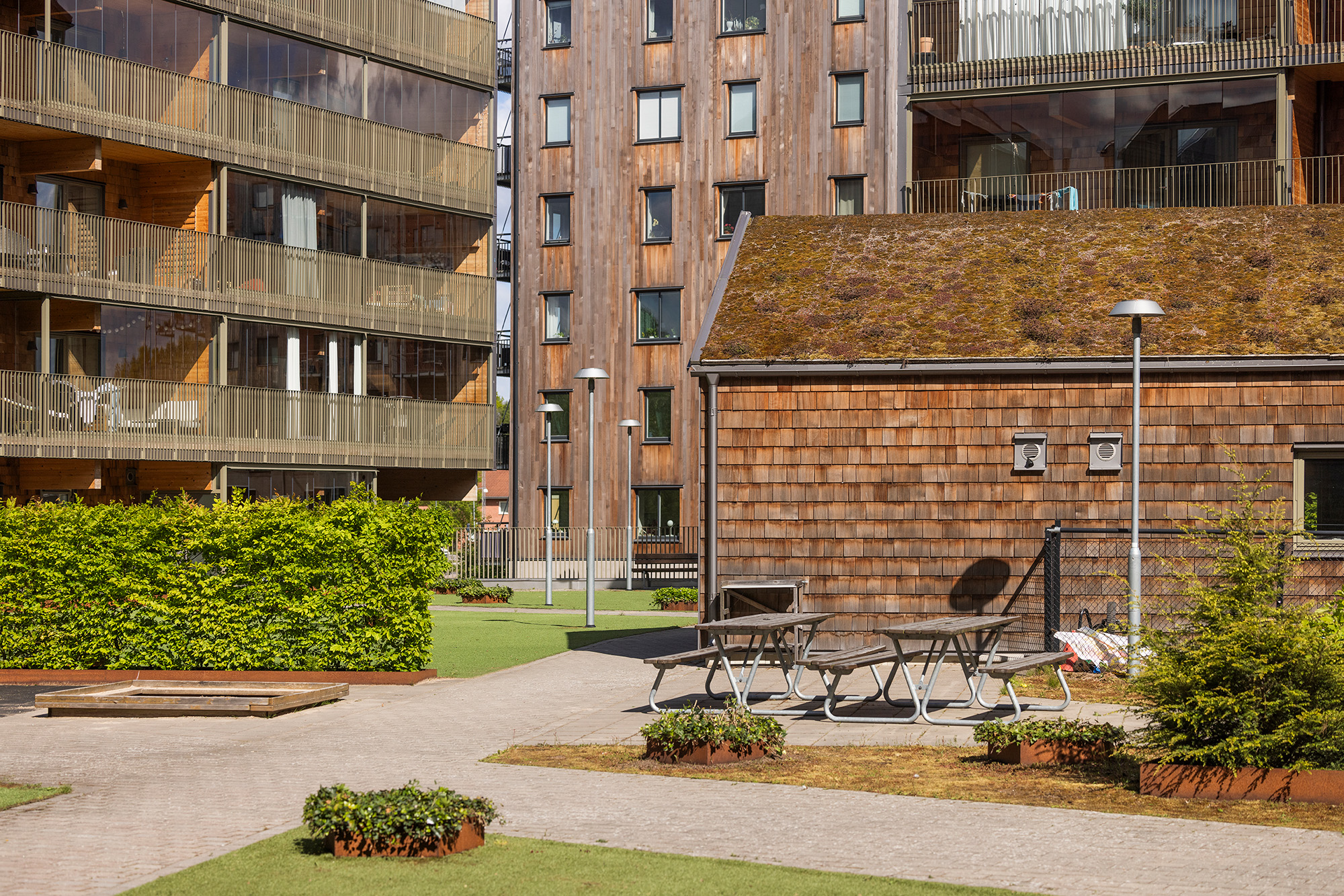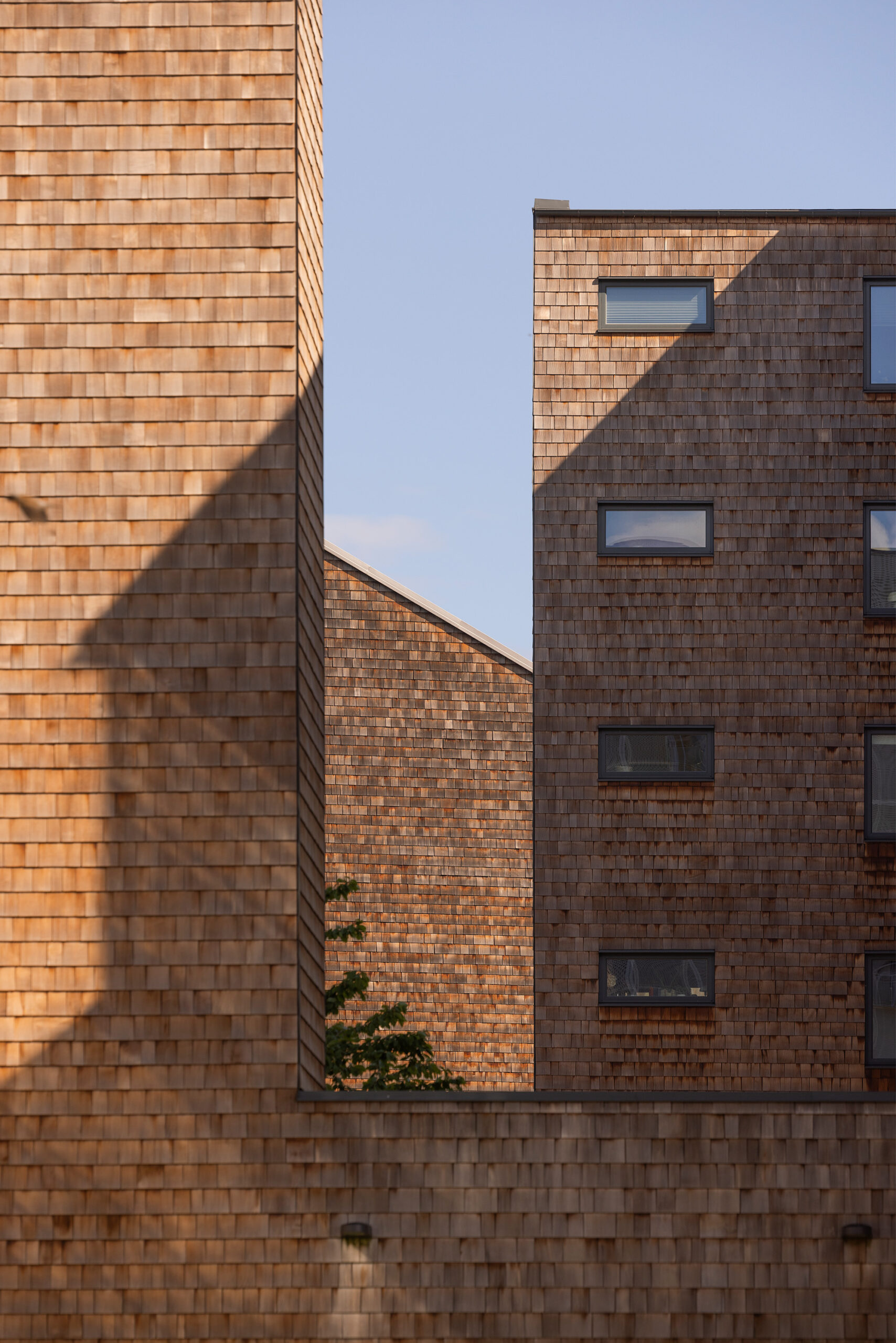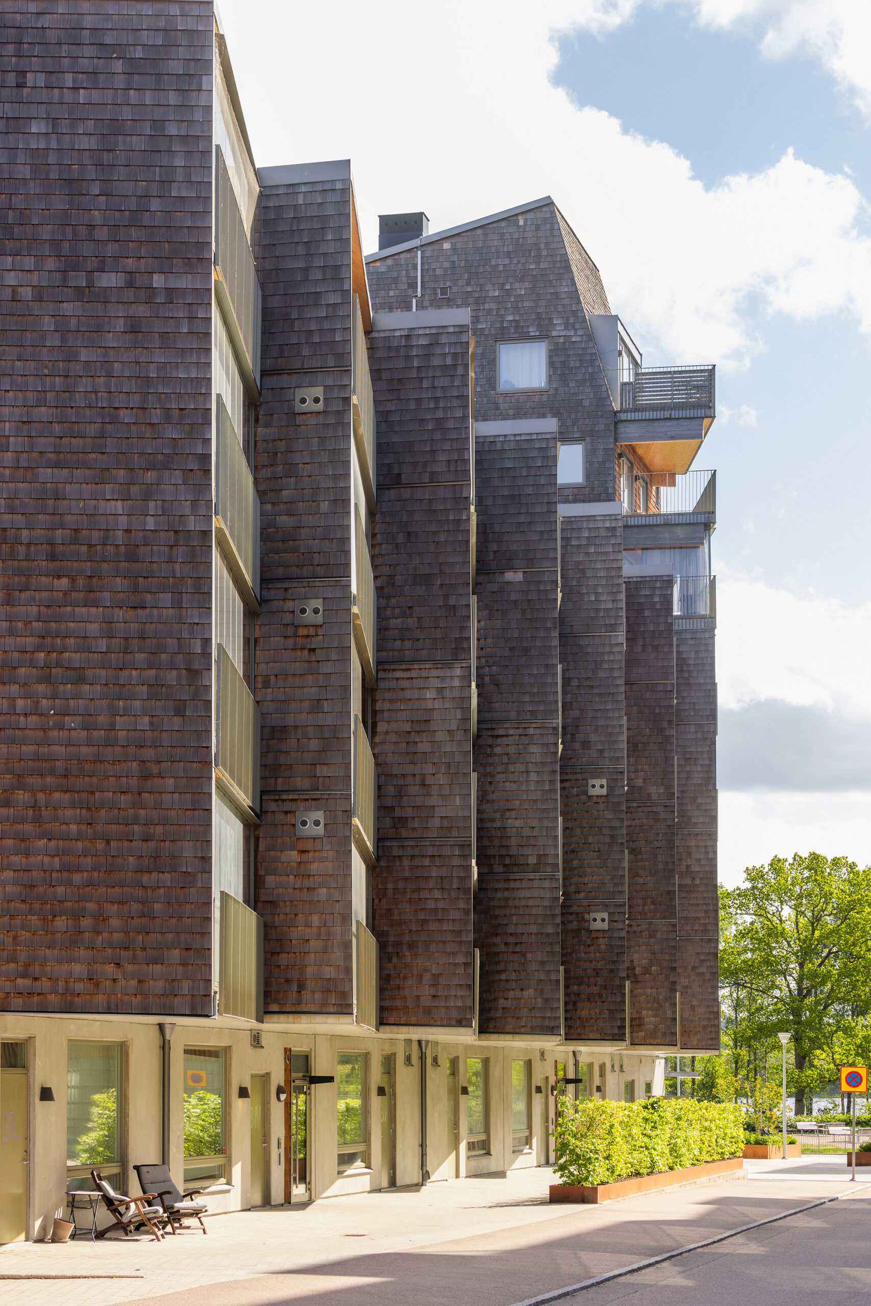 Byggnaderna uppfördes i två etapper, med massivträstomme som bärande materialval och cederspånpanel på fasaderna. Resultatet är ett kvarter med låg klimatpåverkan, sund inomhusmiljö och gedigen byggkvalitet – där varje bostad präglas av både funktion och karaktär.